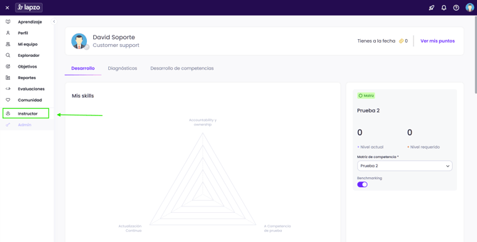 Paso 1: Ingresa a la plataforma y asegúrate de contar con permisos de Instructor y en el menú lateral izquierdo, selecciona la opción 📚 Instructor.
