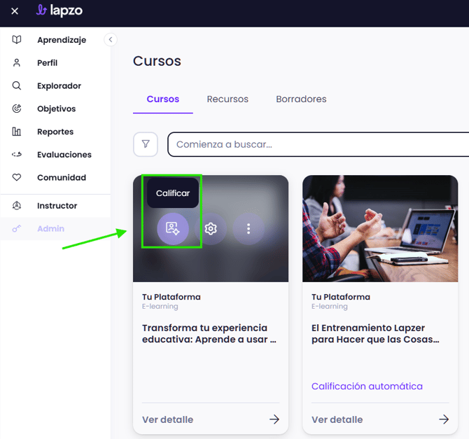 Paso 2: Allí se mostrarán todos los cursos que has creado. Coloca el cursor sobre la tarjeta del curso que deseas revisar y haz clic en la opción ⭐ Calificar.