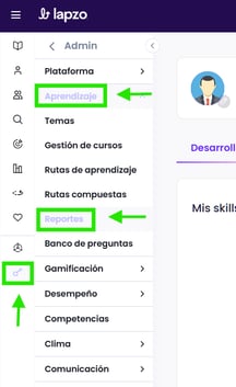 Paso 1: En el menú lateral izquierdo, ve a Administrador (o Admin) y Ingresa a Aprendizaje → Reportes.