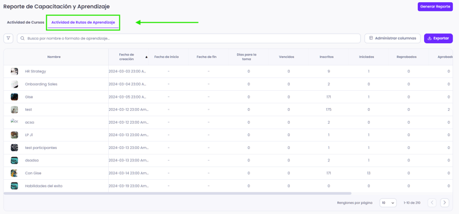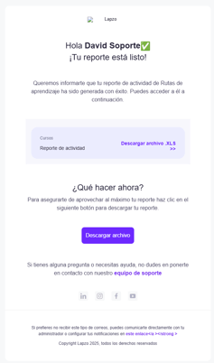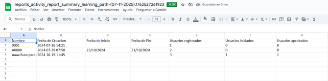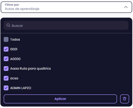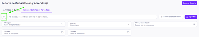 📈 Caso de uso: Esta funcionalidad permite a los administradores exportar un resumen de las rutas de aprendizaje que visualizan en la plataforma. Todo lo que configures en pantalla —filtros, columnas y orden— se reflejará tal cual en el archivo .xlsx que recibirás directamente en tu correo electrónico.