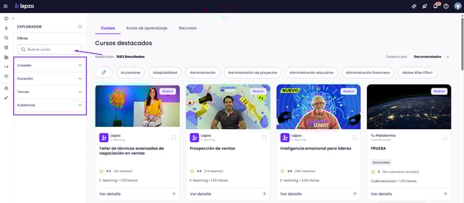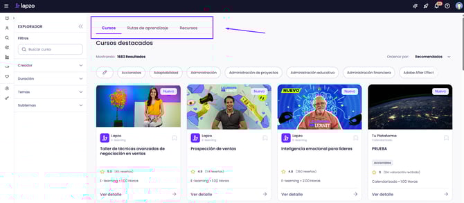 Explora y administra tus Programas de Aprendizaje (LPs) directamente desde el Explorador de cursos, facilitando la visualización, búsqueda y acceso a rutas de aprendizaje dentro de la plataforma.