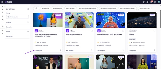 💡 Pro Tip: Usa los filtros combinados (por tema, creador, tema o duración) para encontrar LPs que se ajusten a tu plan de desarrollo.