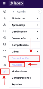 Paso 1: Ingresa a la plataforma como Administrador. Dirígete al módulo Comunicación y selecciona Anuncios.