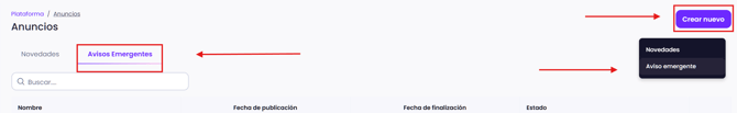 Paso 2: Selecciona el apartado llamado: Avisos Emergentes y luego crea un nuevo anuncio haciendo clic en Crear nuevo y luego en Aviso Emergente.