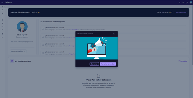 🔍Caso de uso Los anuncios embebidos permiten mostrar mensajes emergentes al iniciar sesión en Lapzo 🎯. Los administradores pueden personalizar el contenido con texto, imágenes o enlaces y segmentarlo según roles, unidades organizativas (OU) o propiedades de usuario, logrando una comunicación directa y relevante sin saturar a toda la base de empleados.