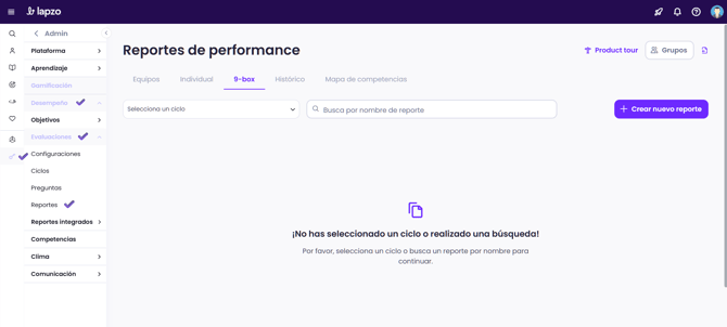 Paso 1: Ingresar al módulo de 9box desde el panel de administración: admin>Desempeño>Evaluaciones>Reportes>9-box y selecciona la opción de Crear nuevo reporte