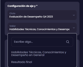 Permite al administrador configurar los ejes del 9box seleccionando entre el resultado final o una sección específica de ciclos cerrados. Así, se pueden cruzar datos como desempeño vs potencial con mayor precisión y flexibilidad.