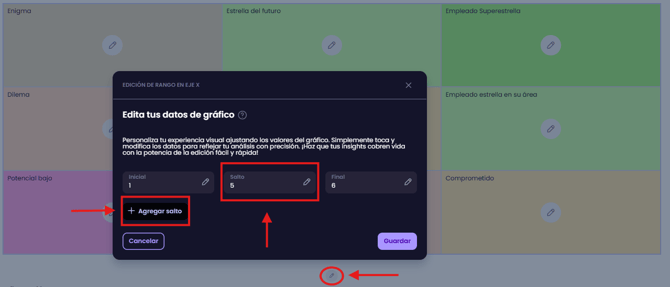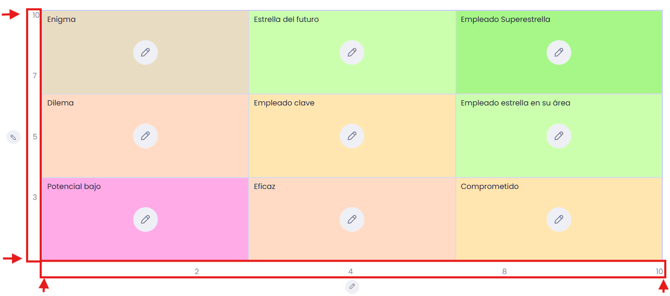 Esta funcionalidad permite a administradores de RH personalizar los rangos de los ejes X y Y en el 9 Box, logrando una representación más precisa del talento según su desempeño y potencial.