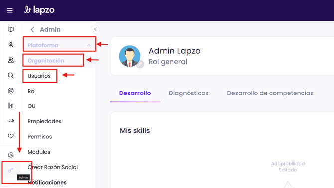 Dirígete a Admin → Plataforma → Organización → Usuarios.