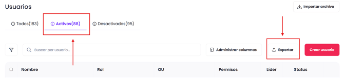 Selecciona la opción “Activos” para visualizar todos los usuarios actualmente activos, luego haz clic en el botón “Exportar” para descargar la lista completa de usuarios activos.