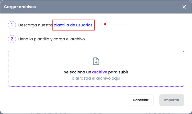 Haz clic en “Descarga nuestra plantilla” para obtener la plantilla de usuarios.