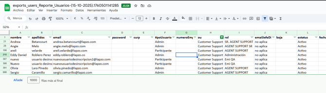 A partir de la celda A3, comienza a copiar y pegar las filas de los usuarios que filtraste previamente en el archivo exportado de los usuarios activos.