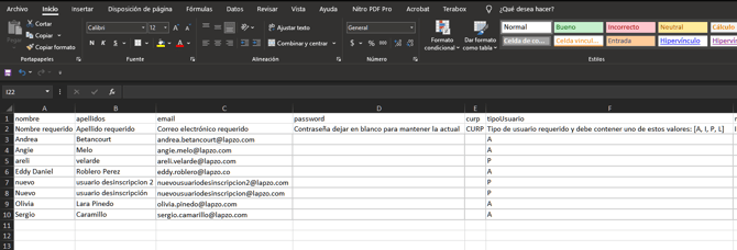En la columna “Tipo de usuario”, asegúrate de colocar solo la inicial del tipo (A = Administrador, I = Instructor, P = Participante, L = Lite).