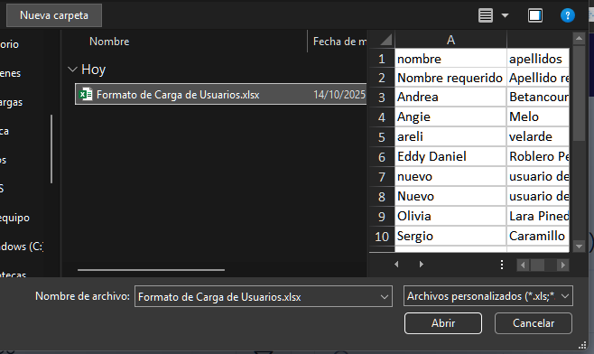 Para reactivar usuarios, utiliza la misma plantilla que cargaste, pero elimina las fechas de la columna “Fecha desactivación”.