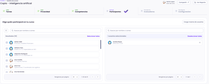 📝 Nota: Esta configuración también aplica para rutas de aprendizaje. Para hacerlo, ingresa como administrador al módulo “Rutas de aprendizaje”, selecciona la ruta deseada, ve a la sección “Participantes” y repite los mismos pasos descritos arriba.