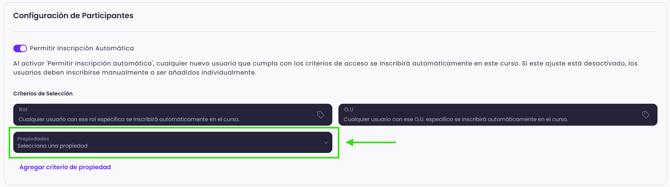 permite a los administradores inscribir automáticamente a los colaboradores en cursos o rutas de aprendizaje, usando como criterio una o varias propiedades personalizadas ya creadas en su instancia. Por ejemplo: área, rol o sede.