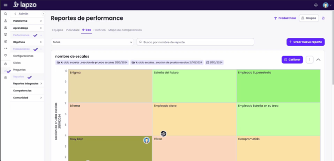 Paso 1: Ingresar al módulo de reportes en: Admin>Performance>Evaluaciones>Reporte y selecciona el reporte 9box.