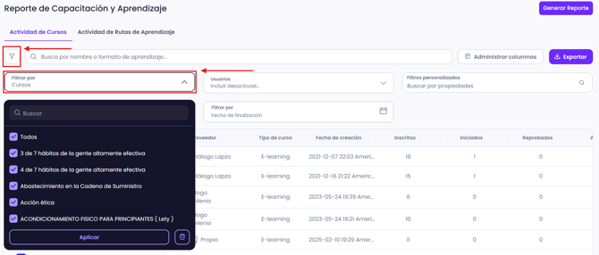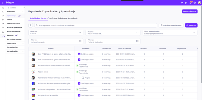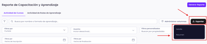 Los administradores ahora pueden exportar reportes de cursos con campos clave como propietario, ID empleado, estatus, último intento y fecha límite para un mejor análisis del progreso.