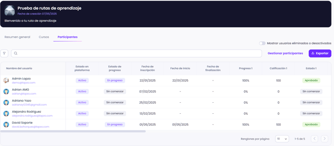 🧰 Filtros: estatus de progreso, fechas de inscripción