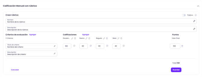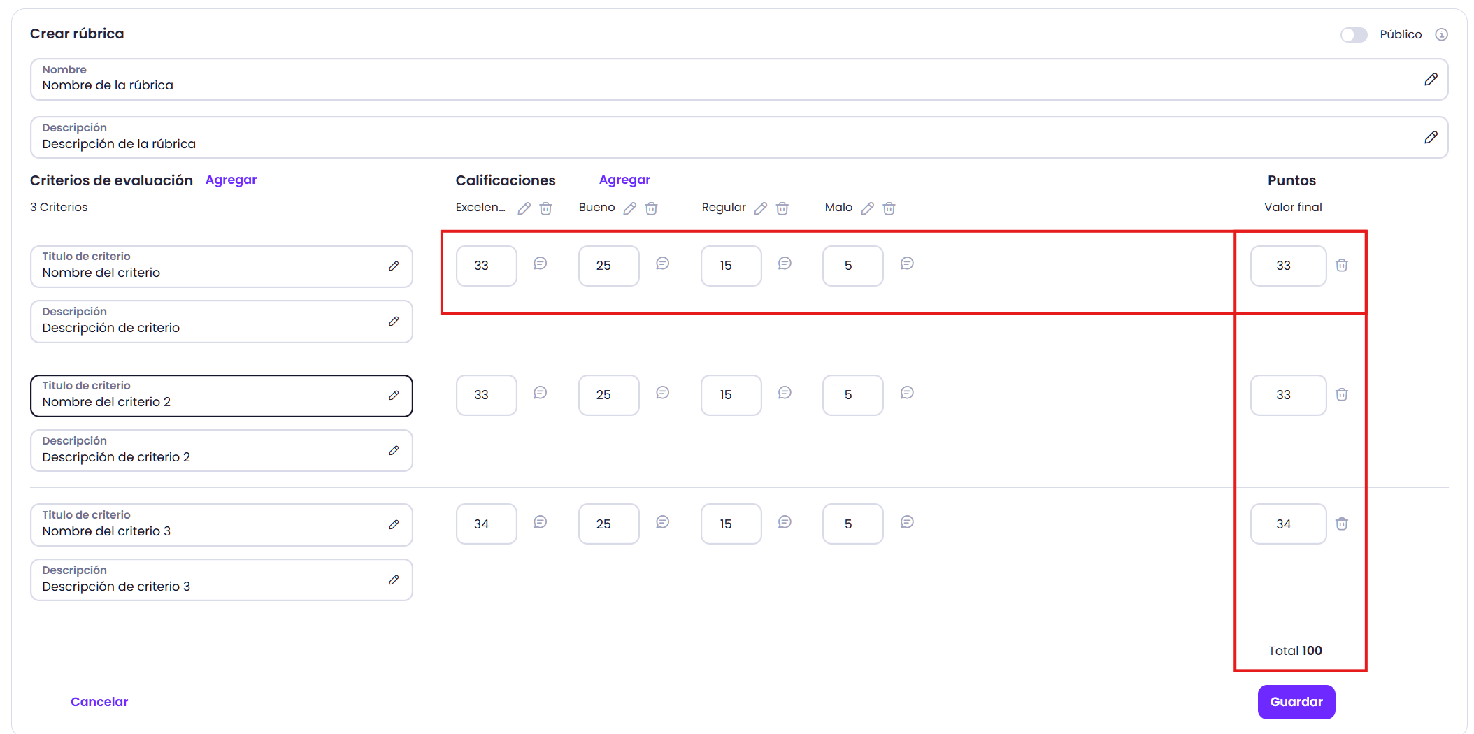 Si agregas varios criterios, asegúrate de que la suma total de los puntos asignados a cada uno sea igual a 100, ya que este será el valor base para calcular la calificación final del participante.