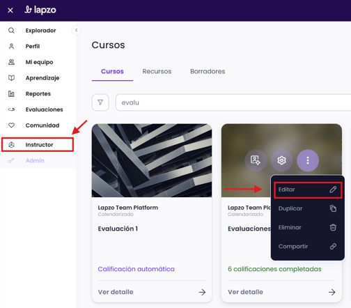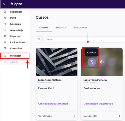 🔹 Paso 7: Regresa al panel del instructor, ve al curso y dale click a la opción de Calificar.