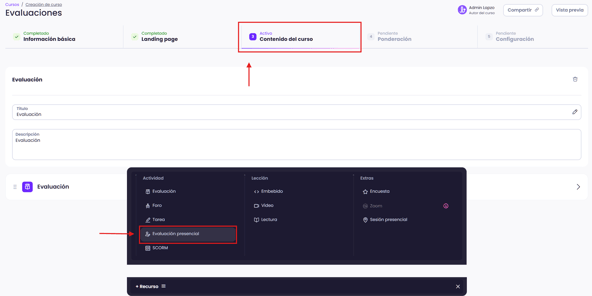 🔹 Paso 2: Dirígete al apartado Contenido del curso y agrega un recurso del tipo Evaluación presencial.