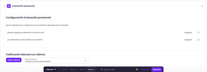 ⚠️ Nota importante: La configuración de la rúbrica es obligatoria. Sin ella, no será posible calificar la evaluación presencial desde el panel de Calificación, ya que no se mostrará ninguna información para evaluar.